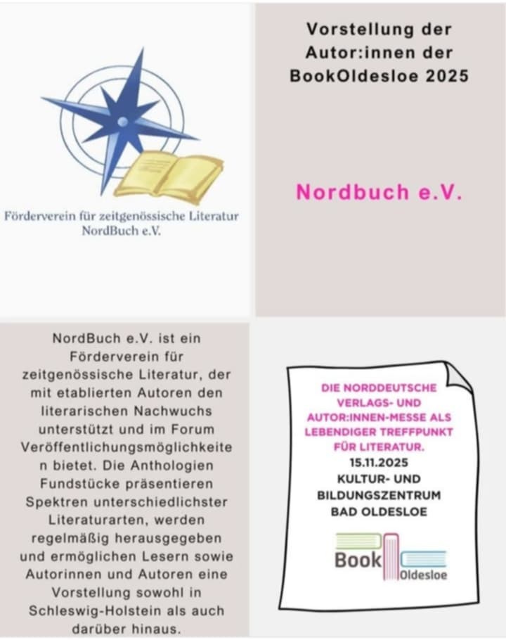 Am Samstag, den 15. Nov. 2025 von 11- 17 Uhr laden wir als Teilnehmende mit dem Förderverein für zeitgenössische Literatur NordBuch e.V. als gemeinnütziger Literaturverein zu der BookOldesloe in Bad Oldesloe ein. Dort stellen sich Autorinnen und Autoren, Vereine und einige norddeutsche Verlage ein.